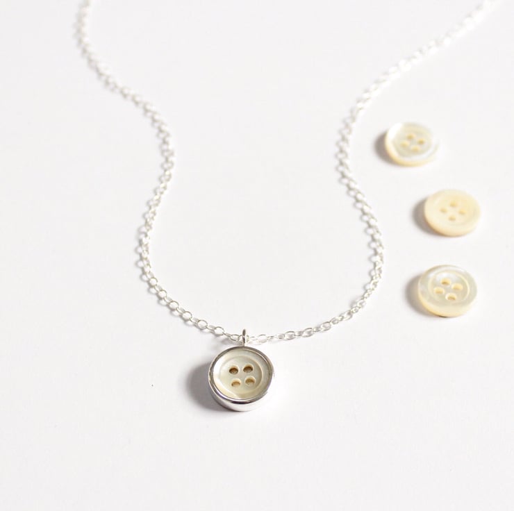 The buttons are sourced from a Brocante in France and at 12mm diameter are a great size, perfect hung on a 16" sterling silver chain. So lovely. I love mother of pearl encased in silver.