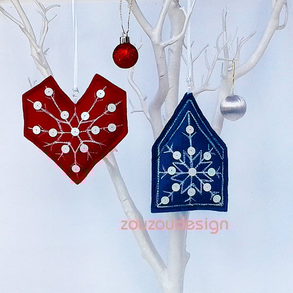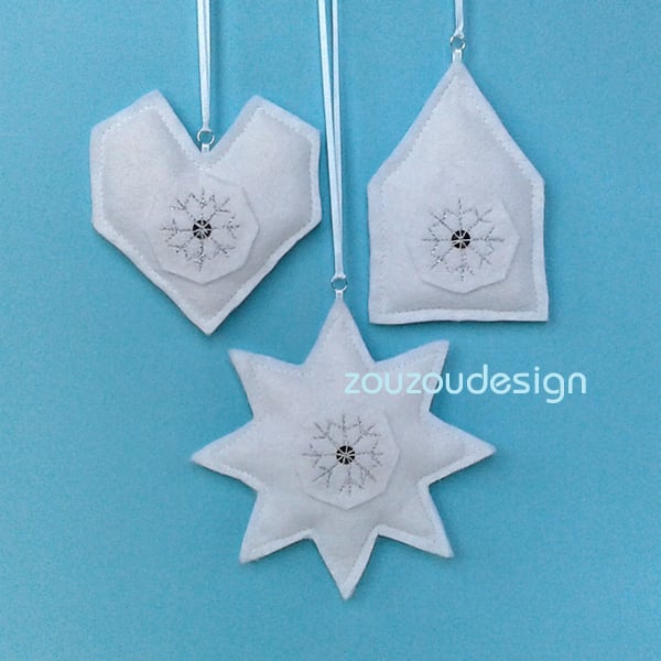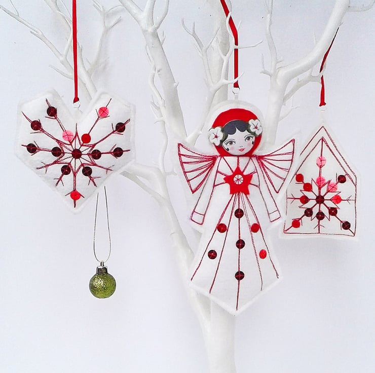 The snowflake, house and heart felt ornaments are fun to sew and make lovely decorations for the home at Christmas time. They can be made from white felt or in your own favourite Christmas decor colours. The ornaments can be displayed separately or together on a garland.
