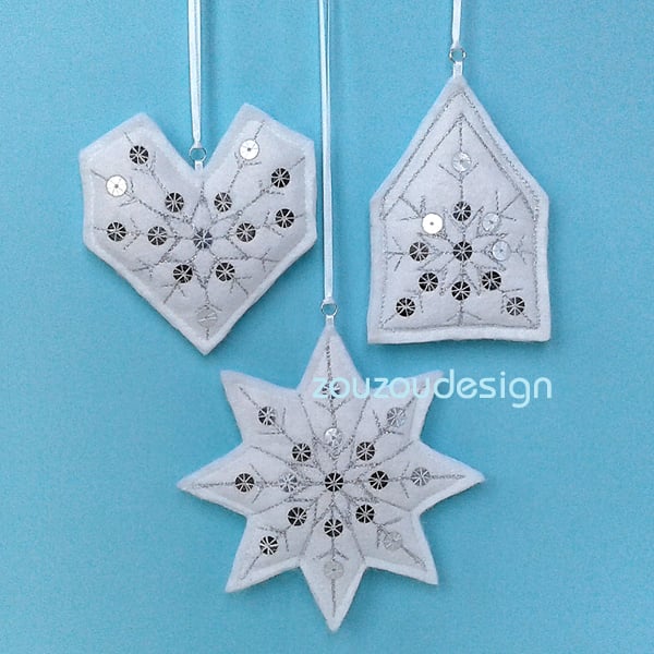 The snowflake measures approx. 14cm (5 1/2"), the house 12cm (4 3/4") and the heart 11cm (4 1/4") in length.