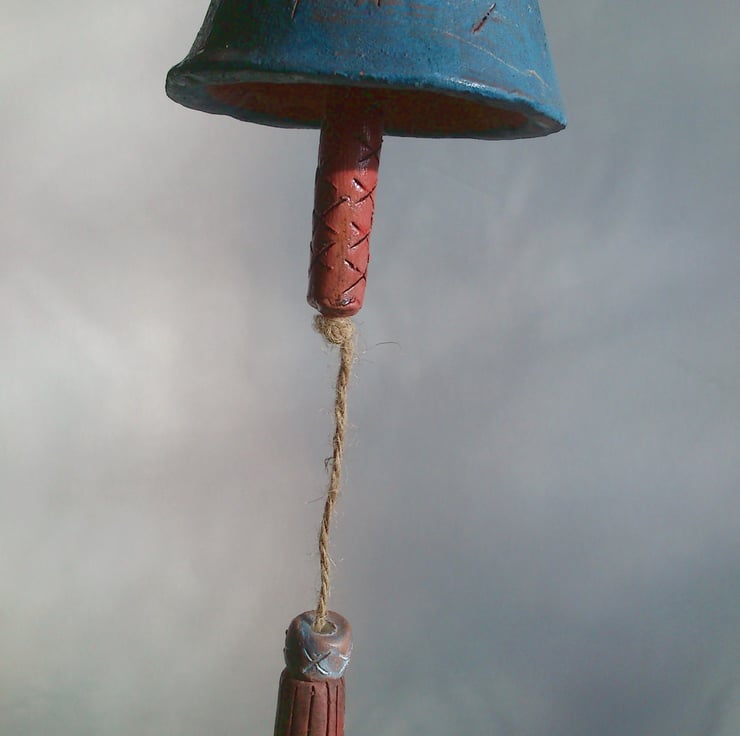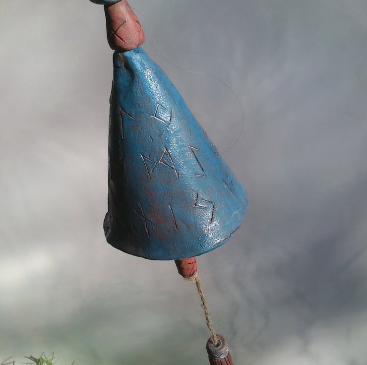 This lovely rune etched bell is approximately 4 inches long and adorned with copper and blue tinged beads. The bell is coloured a lovely deep blue and would be dispatched first class and well wrapped.