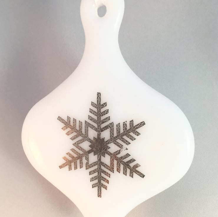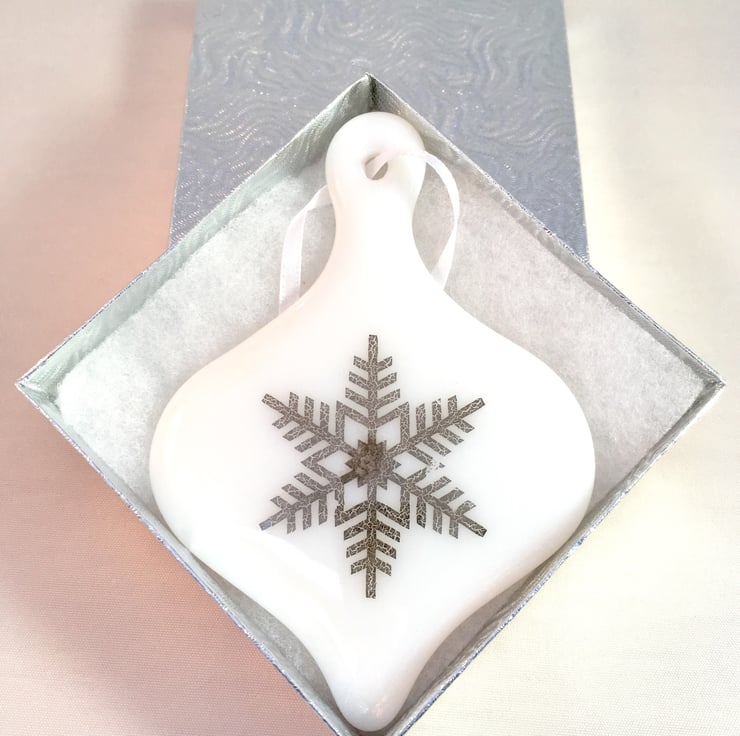 This flat bauble shaped Christmas tree decoration has been formed from fine white glass frit shaped within a ceramic mould. It was first fired over a 12 hour period to fuse into a solid piece. Once cooled a snowflake decal design was added onto the glass before returning it to the kiln once more to fix the pattern. It measures approx 80mm by 110 mm and is hung on white ribbon ready for your tree.