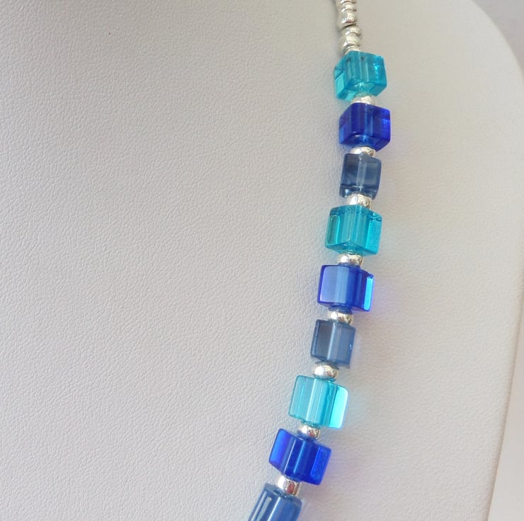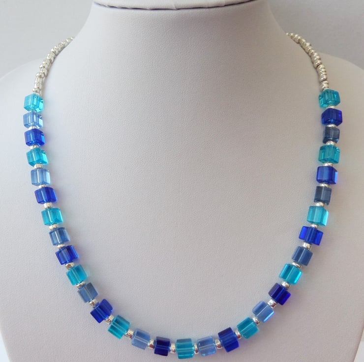 Necklace made using 6mm cube beads in three shades of blue, silver plated spacer beads and silver metallised seed beads.