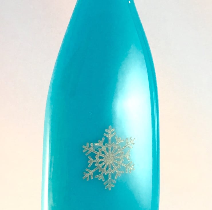 Made from fine spring green glass frit and formed in a ceramic mould during a 12 hour firing to 800 degrees in a specialist glass kiln. After cooling, the flat shape was then decorated by adding a silver snowflake decal before a second firing for a further 12 hours. Measures approx 133mm by 41mm it is hung on white ribbon ready for your tree.