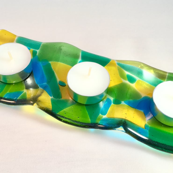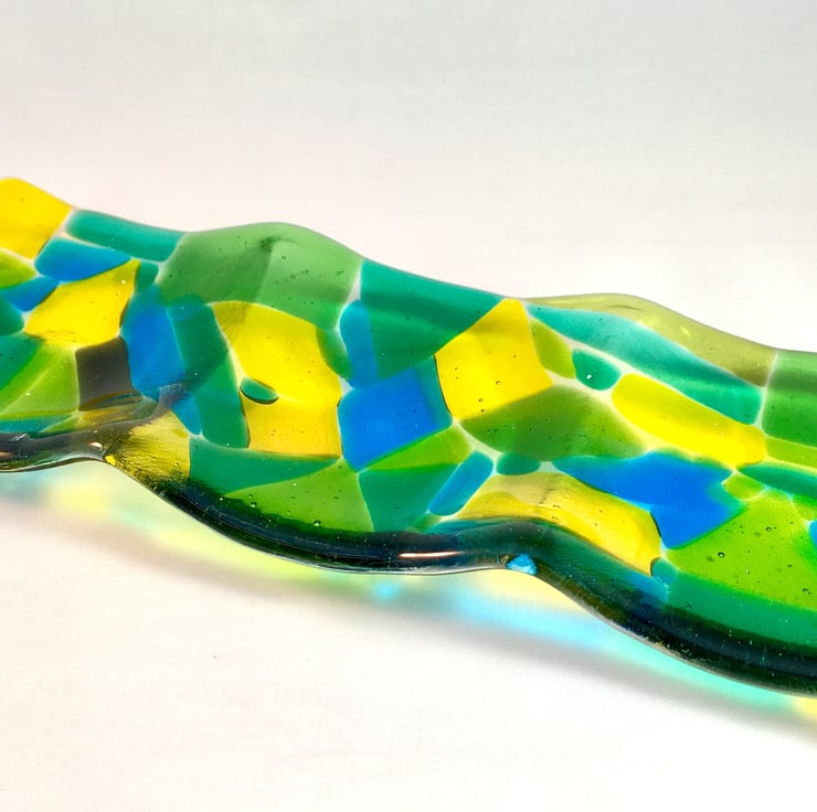 Measuring approx 225mm long, 85mm wide and standing 20mm tall this colourful fused glass tray dish is perfect for tea light candles or as a decorative trinket dish to brighten up a dressing table. It has been assembled using differnt transparent glass in greens, yellows and aquas and fused to 800 degrees Celsius. After gently cooling, including an annealing cycle to prevent thermal shock (which causes the glass to shatter), it was placed in the kiln a second time over a mould to take on the tray form. An annealing cycle was built into this firing as well meaning a total of 22 hours in the kiln.