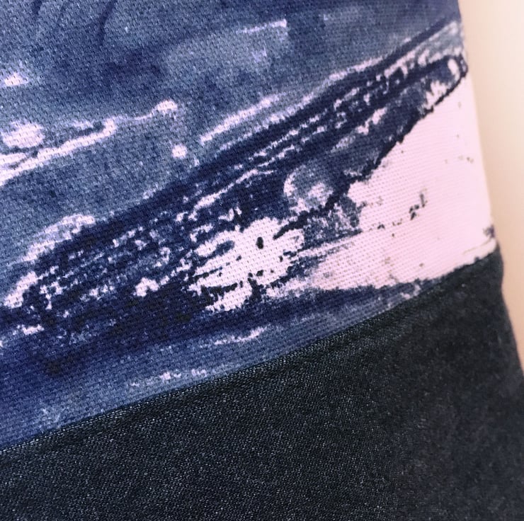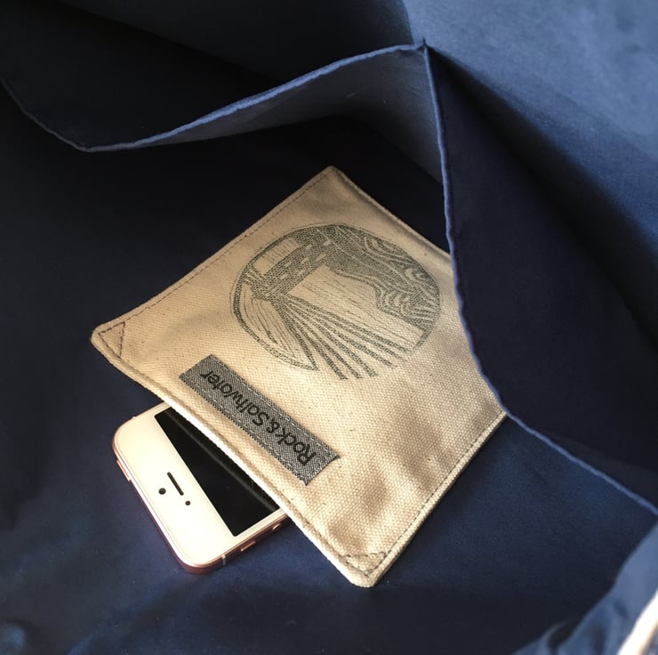 Our sea print design is teamed with a mid-blue washed denim for the base and reverse side of the bag. Lined with navy blue cotton with three interior pockets – two large and one small. The small pocket features our lighthouse lino print and is the ideal size for a mobile phone, keys, or any small item that you need to have easily to hand.