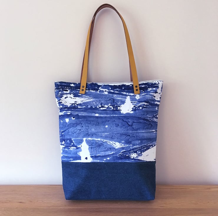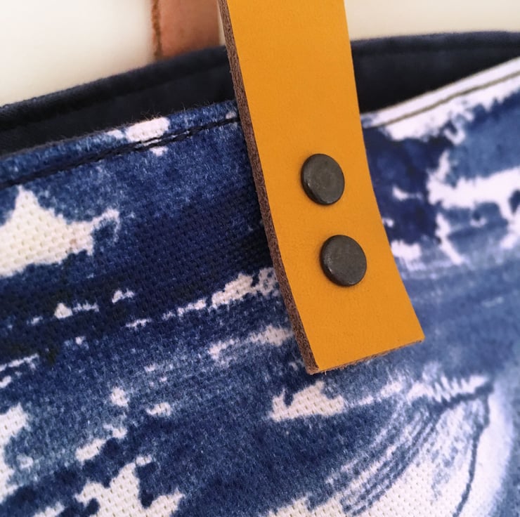 Handmade 'Porthmeor' bag – sea print/denim with mustard yellow leather straps