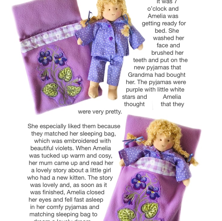 Here he is appliquéd and embroidered onto a sleeping bag made specially for the Mulberry Green characters to go to bed. The sleeping bag is made from soft and cosy fleece in a lovely tan colour and is trimmed with best quality cotton in an Autumn leaf print.