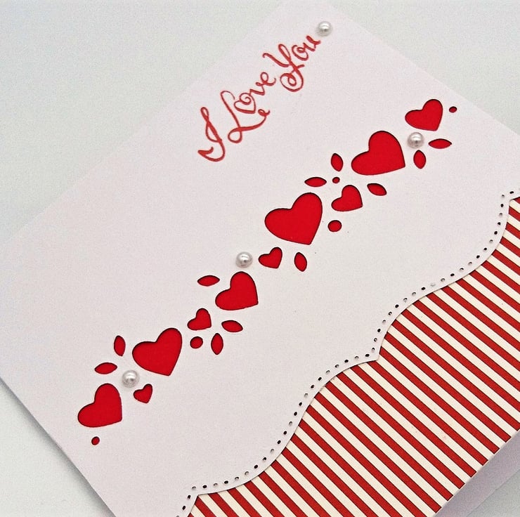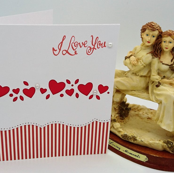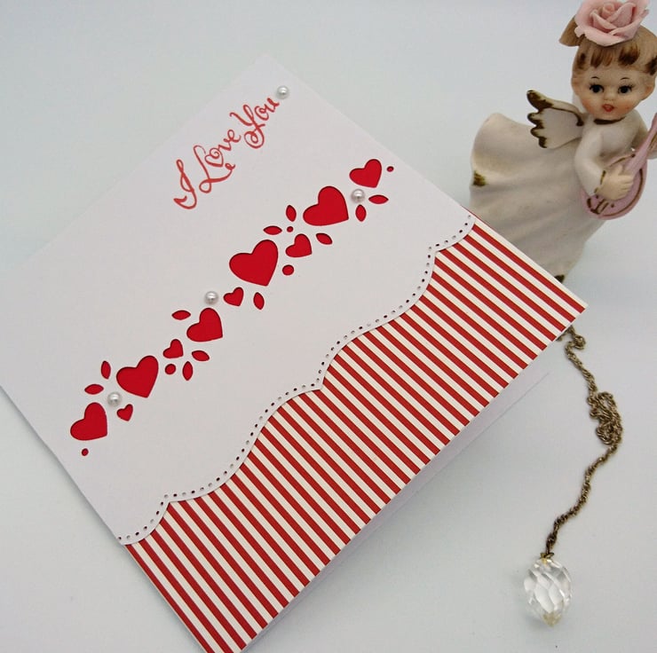 DETAILS: Top Quality White Card, layered with, red card, red and white candy stripes, topped with die cut white card of heart and fancy border, complete with "I Love You" sentiment.