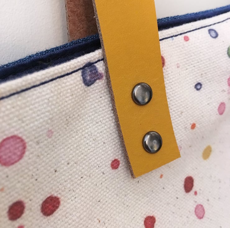 Tote bag, handmade – paint print with mustard yellow leather handles
