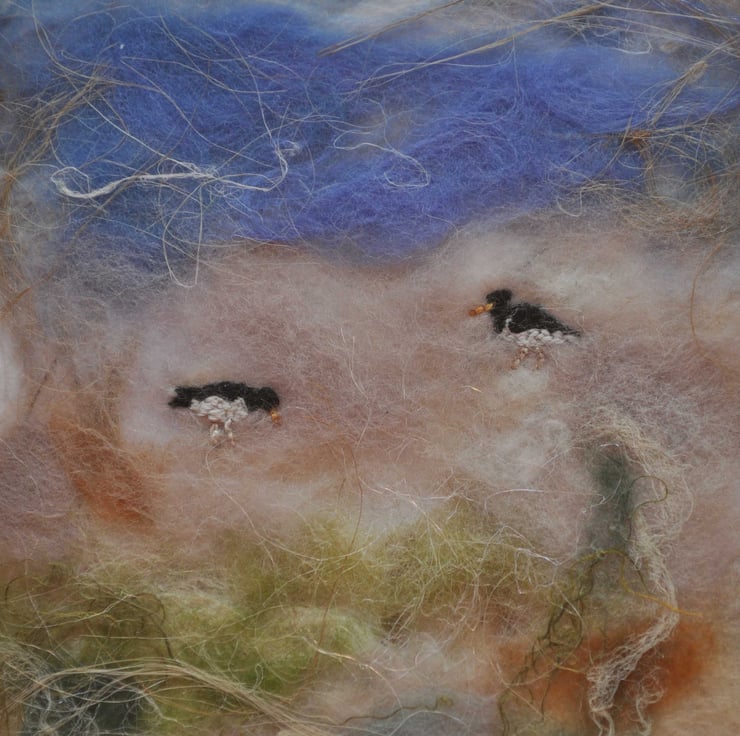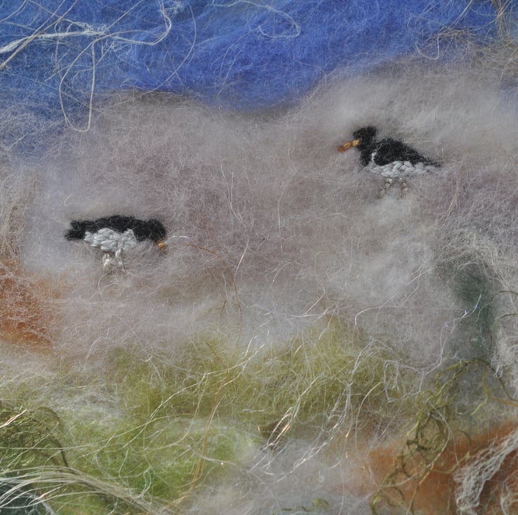 I created this handmade silk paper seascape by fusing natural fibres including string, silk rods and merino wool together. The two oystercatchers are carefully embroidered by hand onto the paper.