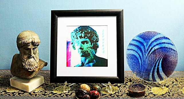 This high quality giclee print is my interpretation of Zephyrus, the Greek god of the west wind. I used my original photograph of an ancient Greek statue, Antinous, in the Delphi Archaeological Museum, Greece.