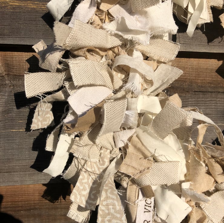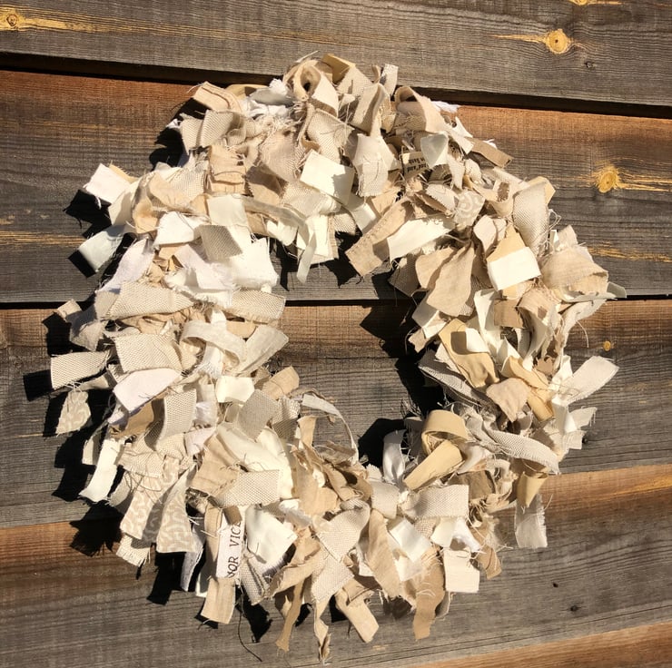 Rag wreath made from lots of strips of cotton and linen in neutral colours, tied to a wire frame. Beautiful at Christmas and all year round