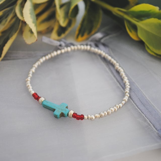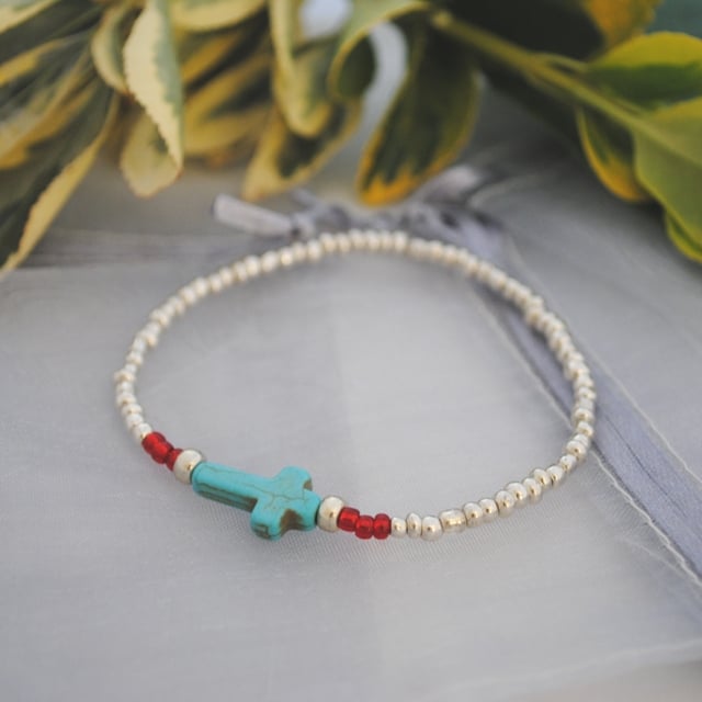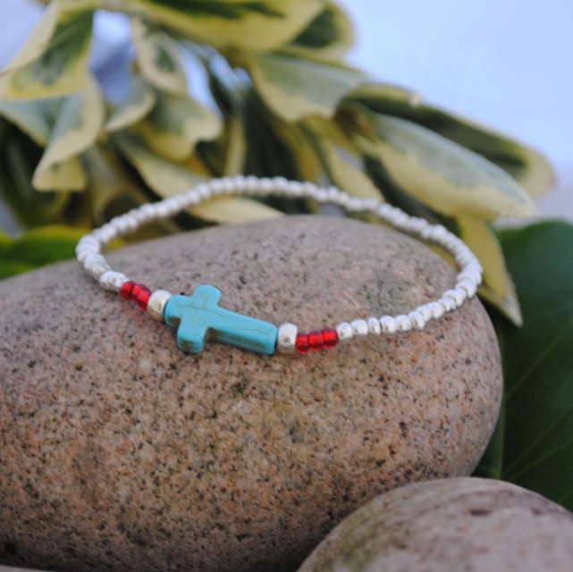 This stretch bracelet is made with silver coloured seed beads with a turquoise howlite cross and red seed beads. Easy to wear on its own or with other bracelets. This listing is for one bracelet.