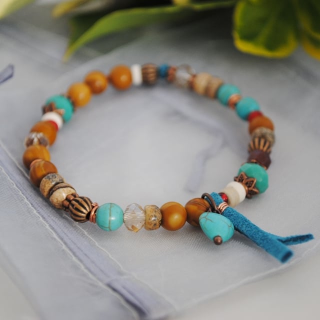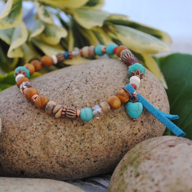 This bracelet features mixed gemstones - including picture jasper, jasper and howlite beads. These beads are mixed with crystals in teal and champagne with other beads in a colour mix of copper, cream, sand & turquoise and teal. The semi-precious stones are highlighted by champagne rondelle crystals with coco-pucalet (wood) heshi beads. Copper highlights are provided by the copper fluted beads, daisy spaces and bead caps. Finished with turquoise suede tassel and a turquoise howlite heart.
