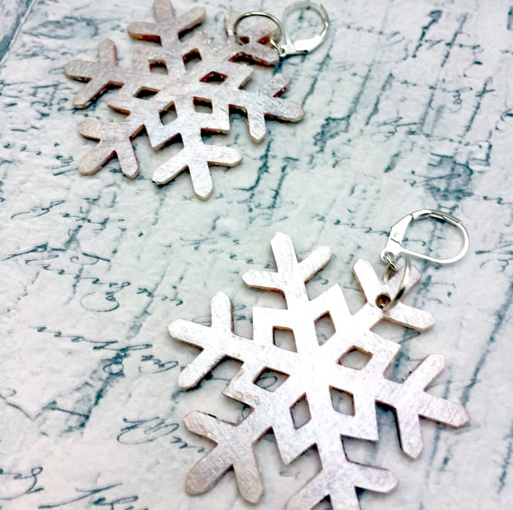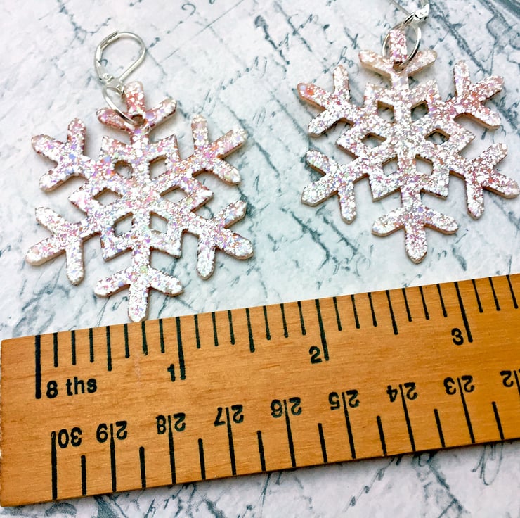 The snowflake shape itself measures 4 cm wide by 5 cm high and with a drop (including the earring finding) approximately 6cm - an earring that will pack a festive punch - but light enough and comfortable to wear!
