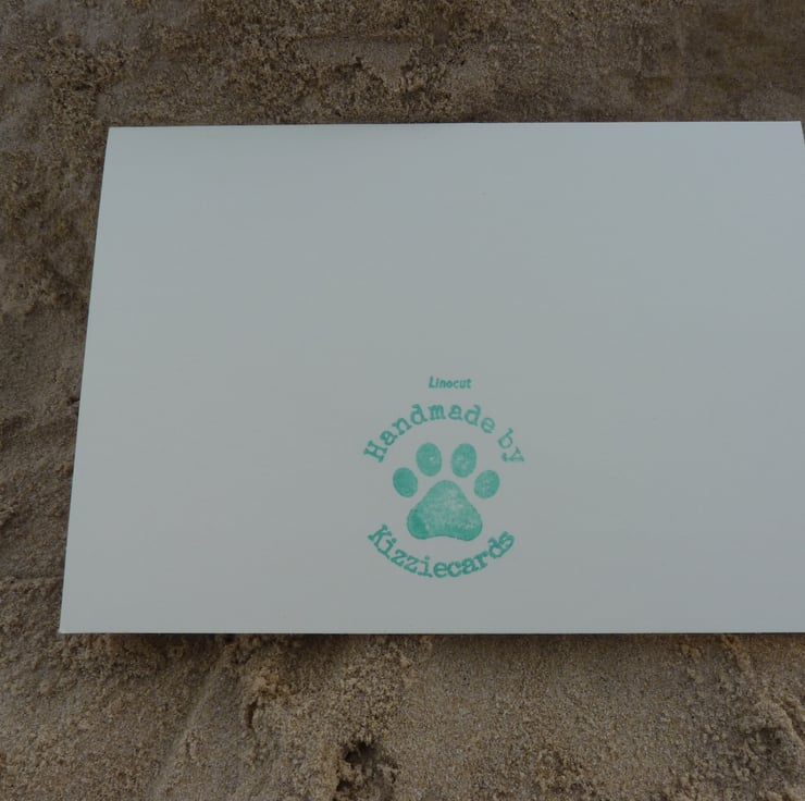 Printed in grey blue onto a 300gsm, 5" x 7" cream coloured card with a matching envelope then signed. The card is stamped on the back as shown and blank inside.