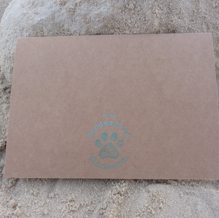 Printed in black onto a 240gsm, 5" x 7" brown Kraftcard with a matching envelope then signed. The card is stamped on the back as shown and blank inside.