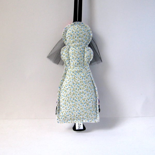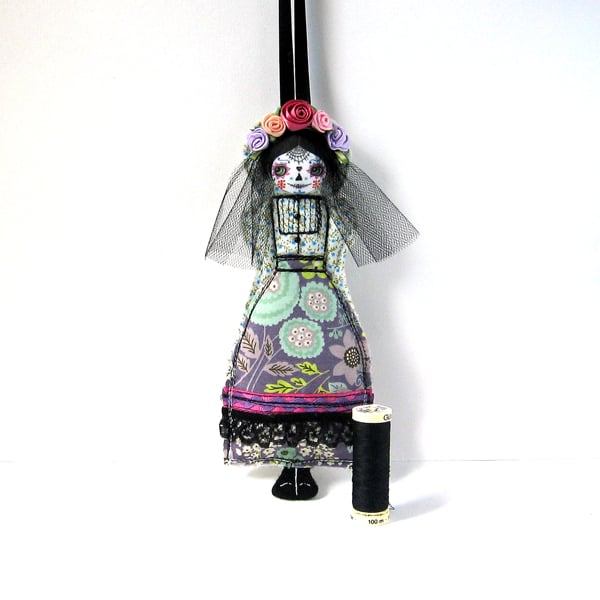 This gothic little Day of the Dead Catrina doll ornament hangs from a black ribbon and is a quirky little creepy cute display doll for the home. It would make a great gift or keepsake for yourself with particular appeal to those into gothic Day of the Dead imagery.