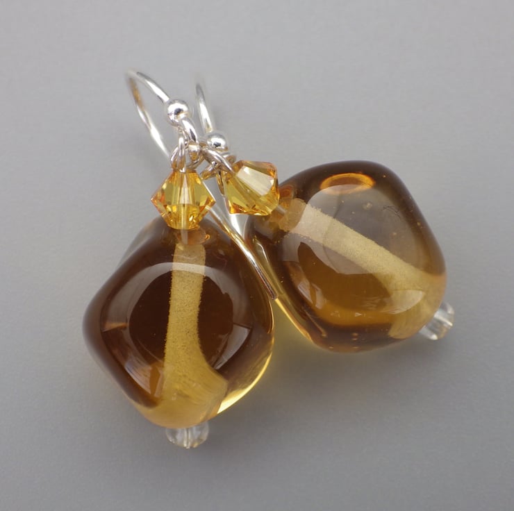 These bright earrings feature a funky lampwork bead in a free form nugget shape. They have been made using glass in a cheerful yellow colour but with a clear quality and a lovely shiny surface. Teamed with fabulous Swarovski bicones in their sunshine yellow shade and with simple clear colourless seed beads, they are finished using Sterling Silver findings to form eye catching earrings.