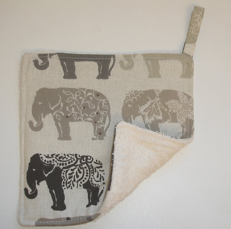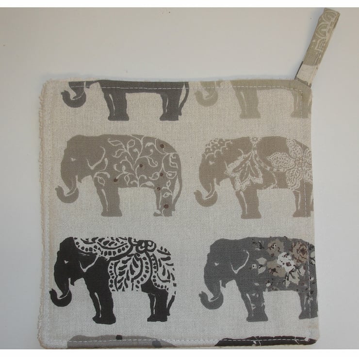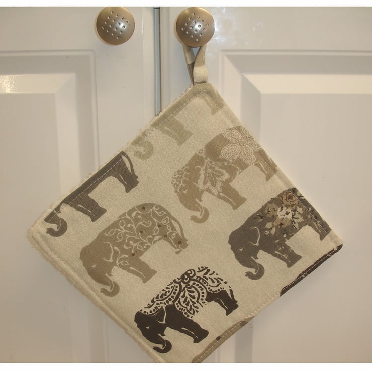 A Pot Holder / Handle Grab Pad / Trivet Mat backed with a cream towel fabric - useful for holding hot pans mopping up around the kitchen and as a surface saver