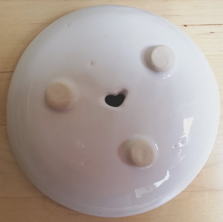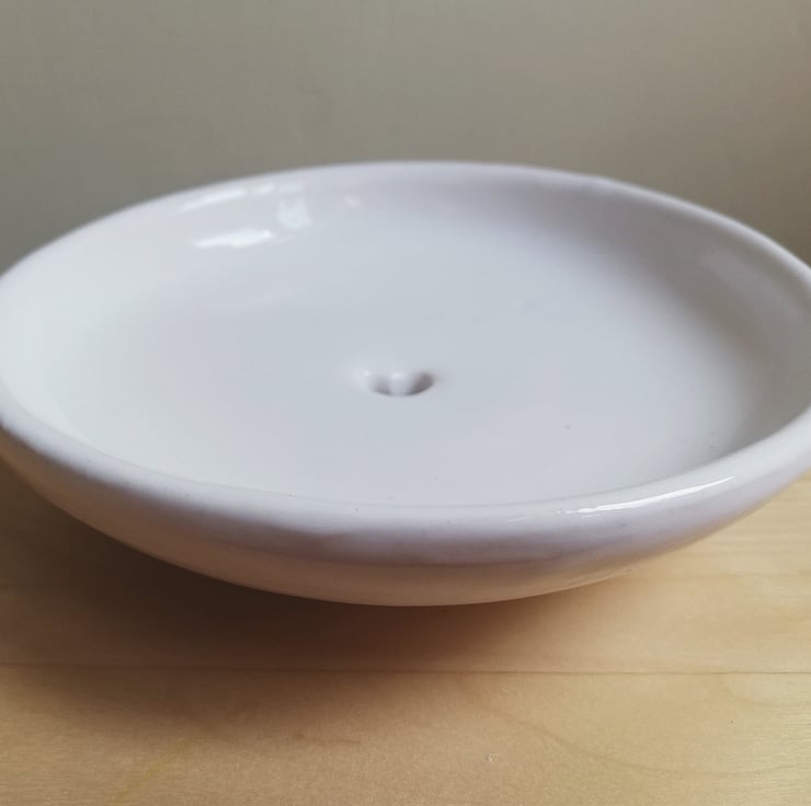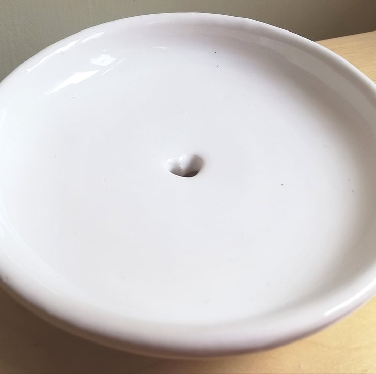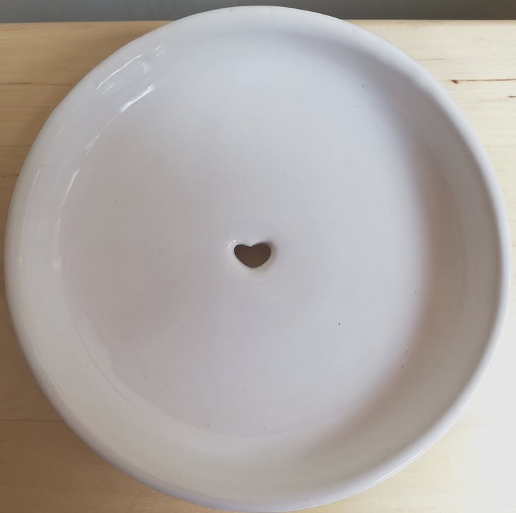 This soap rest was hand thrown on my potters wheel and altered to make a drainage heart decoration. 3 little feet were added to aid drainage and provide a good base to sit on a sink . Once bisque fired in our electric kiln white lead free glaze was added and it was fired once more .