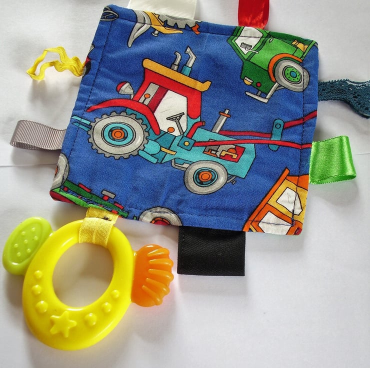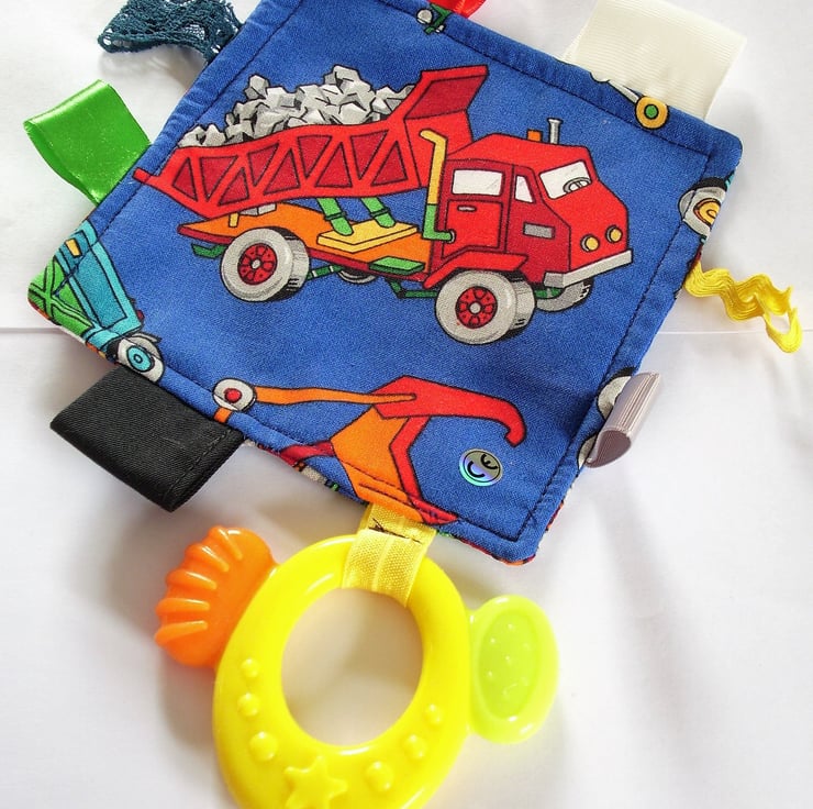 This is a cheerful tagged teether, 5" square approximately. I have stitched an oval yellow silicone teether and ribbons of various colours, widths and textures around it. They are all double stitched for security. One side of the royal blue cloth shows a red tipper truck, and the other a red and blue tractor. I source the teether from a reputable dental supplier. The tagged teether is CE marked and can be machine washed.