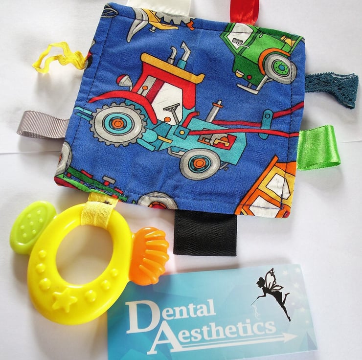 When my youngest grandchild was teething and dribbling constantly, it occurred to me that what he needed was a good teether and a cloth to wipe his sore chin. I found an offcut of cotton fabric and some ribbons from my stash and made him a tagged cloth, to use for his chin. I researched on the Internet to find a source of safe teethers, bought one and attached it to the cloth. For two years he carried his tagged-teether wherever he went. Since then I have made many tagged-teethers. I don't know what 'Dental Aesthetics' thinks I do with all those teethers!