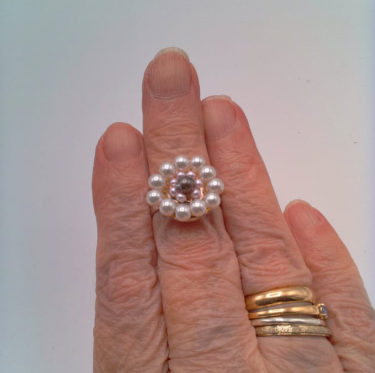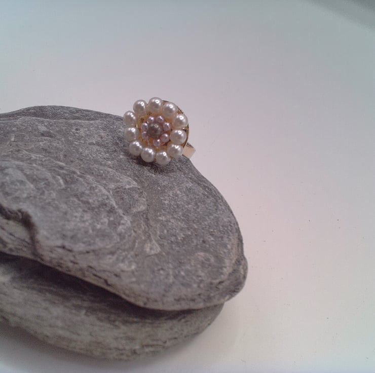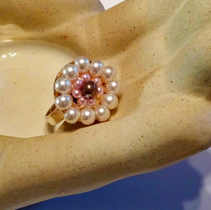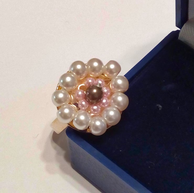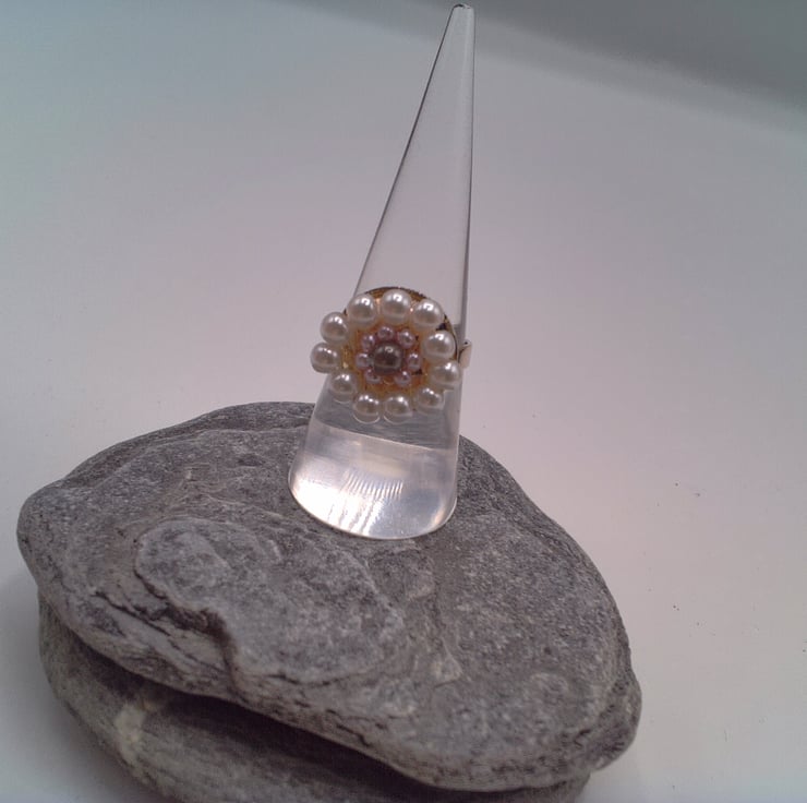 This very pretty adjustable ring would make an ideal gift for a friend or relative for a birthday or anniversary, or it would make a nice treat for yourself. It would go well with any of your Spring and Summer outfits for a day out, for a casual party, or for everyday wear. The ring base is adjustable so it will fit most sized fingers and it has a beaded design sewn onto the silver plated ring base. The pearl beads used are tiny 1 mm lilac seed pearls, 4 mm cream pearl beads and a central 4 mm mauve pearl. The ring will be dispatched wrapped in tissue paper in an organza bag and delivered to you via Royal Mail first class post. The actual shade of the beads may vary depending upon your monitor set up.