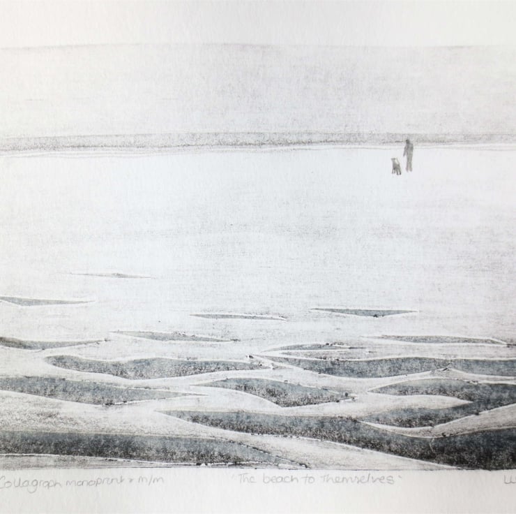 An original handmade collagraph monoprint with mixed media. Just walking the dog along an empty beach at low tide. The wind whistles chasing the sand along the floor. Image size 19.5x14.5cm ( approx 7.5x5.5inch) on paper 24.5x19.5cm (approx7.5x9.5inch). The artwork will be shipped in a cellophane sleeve with cardboard front and back for added protection.
