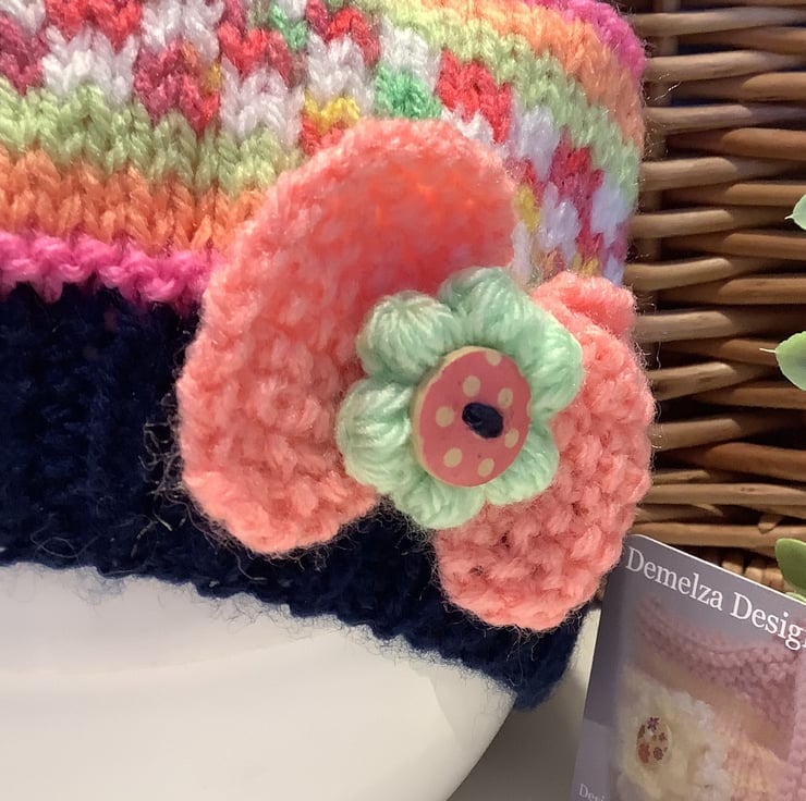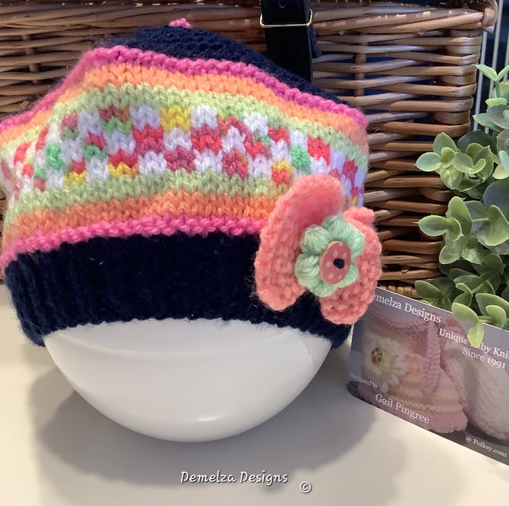 A lovely unique eye catching baby girl's beret style hat designed and totally hand crafted using quality branded French and British manufactured machine washable yarns. The hat has a white knitted large bow set of centre with a genuine wooden button in the centre.