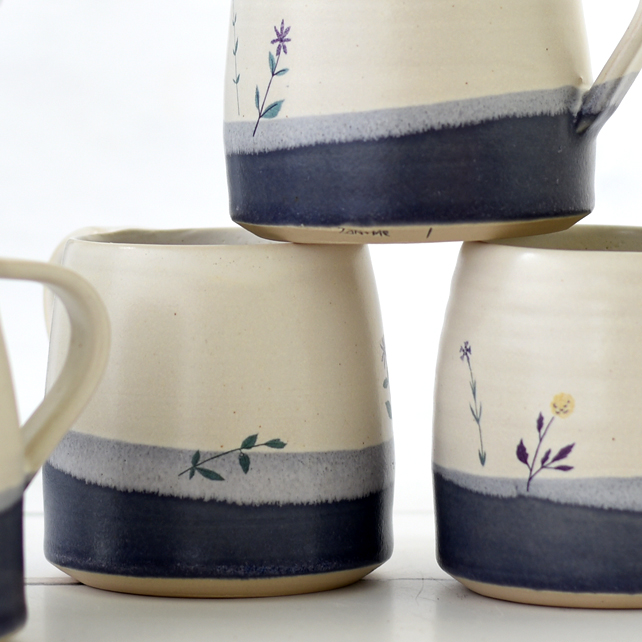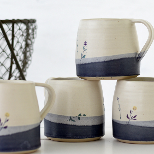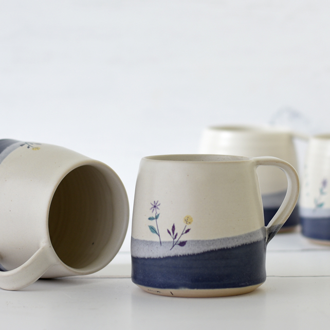 A stylish modern hand-thrown ceramic mug, illustrated with flowers and glazed in blue to white with our maker's mark on the base. Part of our Mendocino series of Illustrated Ceramics. Zanna drew the flowers. Mecki added the mug - the result is a lovely cup that makes hot drinks taste heavenly.