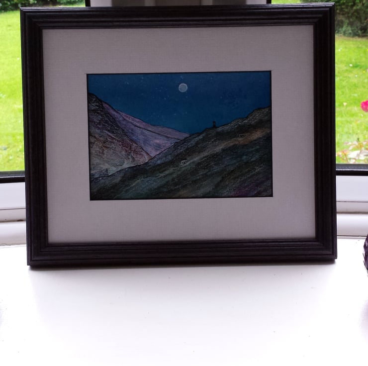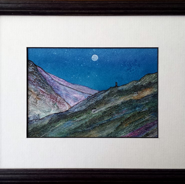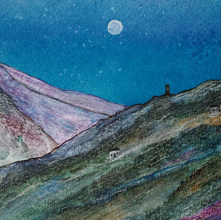 The Night Returns is an original painting triggered by a song lyric. An imaginary mountain nightscape which was created with watercolours and a touch of inktense.Textural effects have been used to create atmosphere.