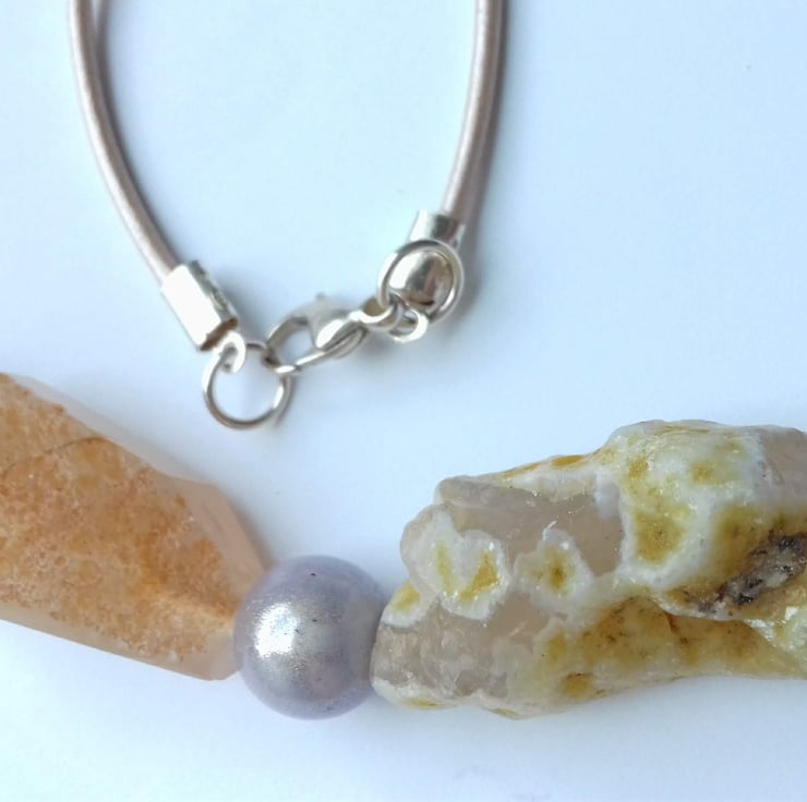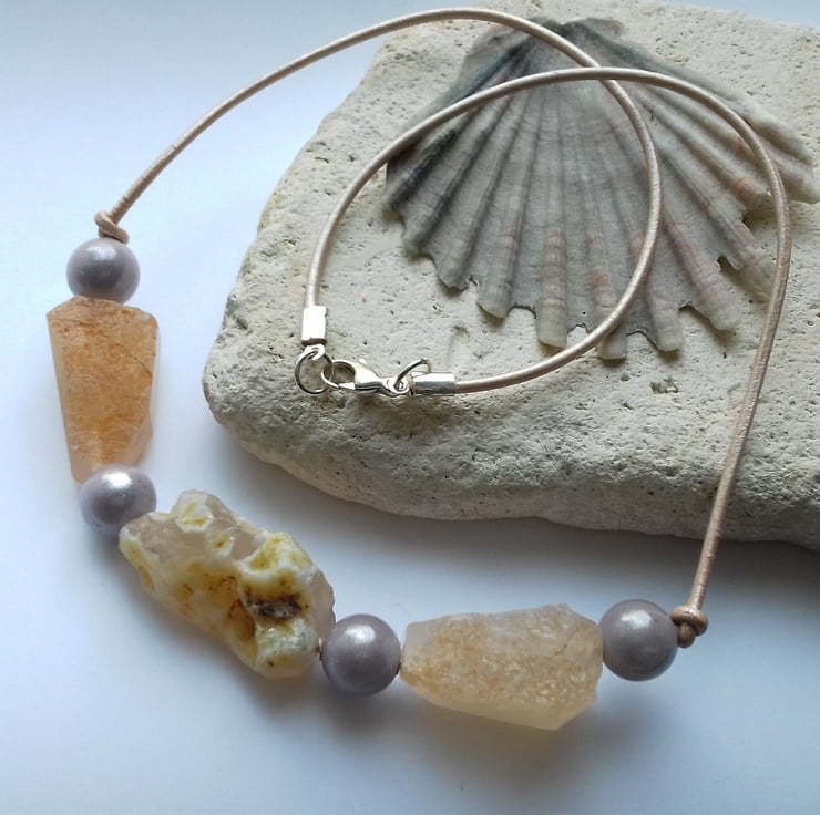 Raw Opal and Miracle Bead Necklace strung onto a strong piece of leather with a sterling silver clasp.