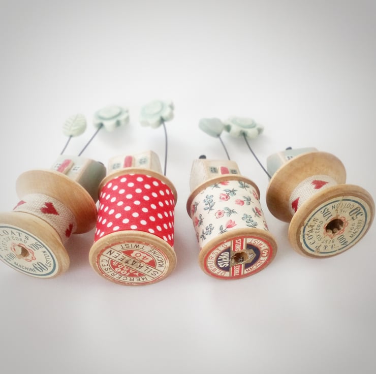 I love finding these old bobbins on rummaging trips! The tiny homes perch happily on top!