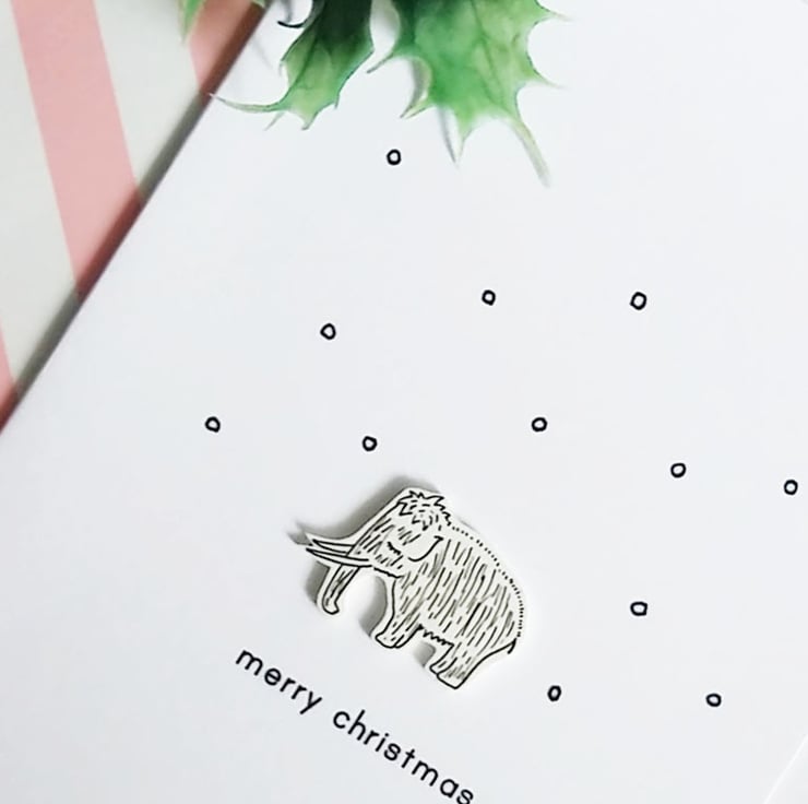 The woolly mammoth had been hand drawn on to white shrink plastic and varnished. Decorated with hand drawn snow. On a white A6 card with envelope.
