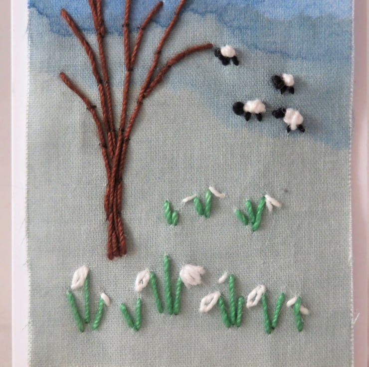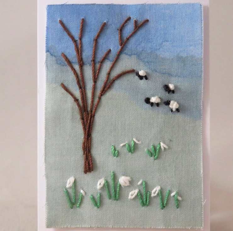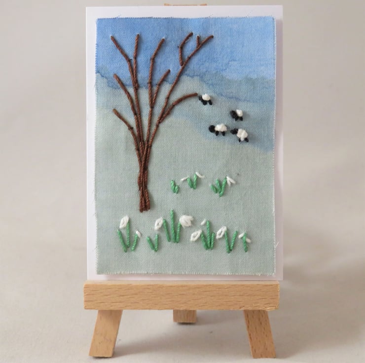 A pretty, painted and simply embroidered, ACEO featuring a winter landscape of snowdrops and sheep.