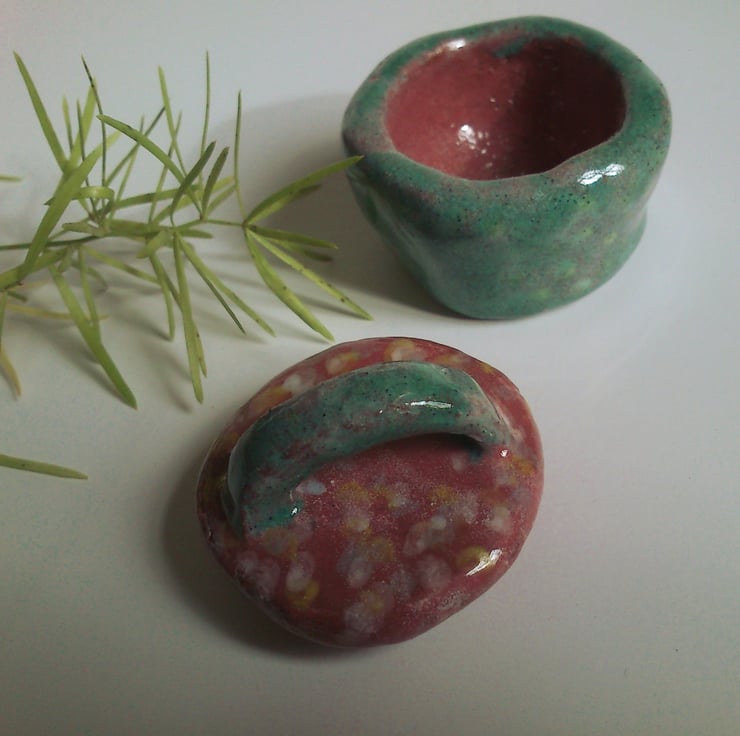 This two tone Coral pink and aqua pot is idea for keeping little trinkets, such as balding mans hair bits !! , rings, or even fairy dust !! Useful for storing anything small.
