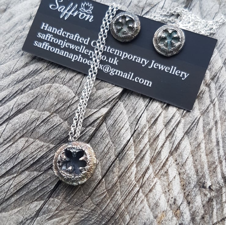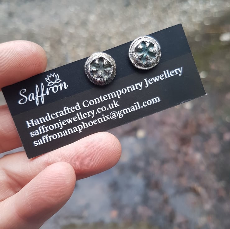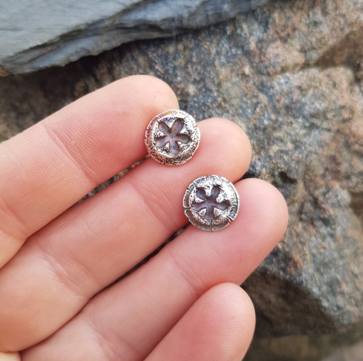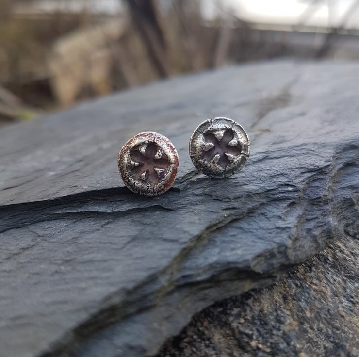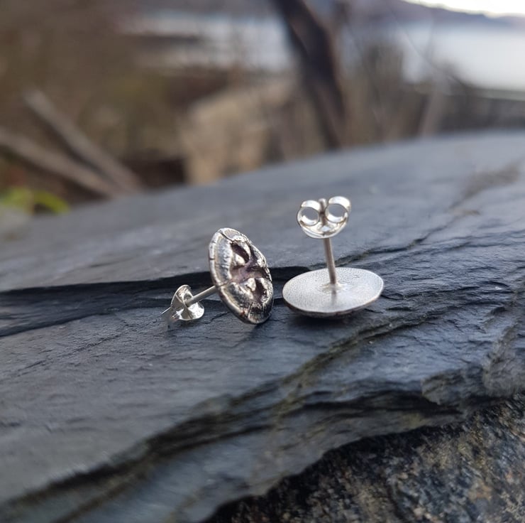 These lovely studs are solid fine silver and made from real Eucalyptus nuts. The fronts have been given an antique looking patina to highlight their texture, and gives them subtle petrol colours that will darken with age.
