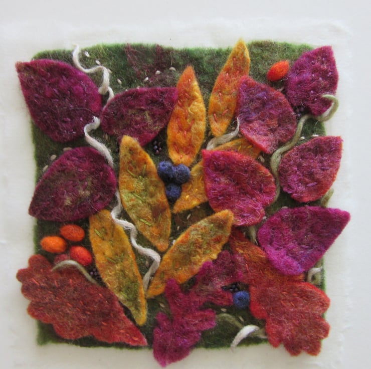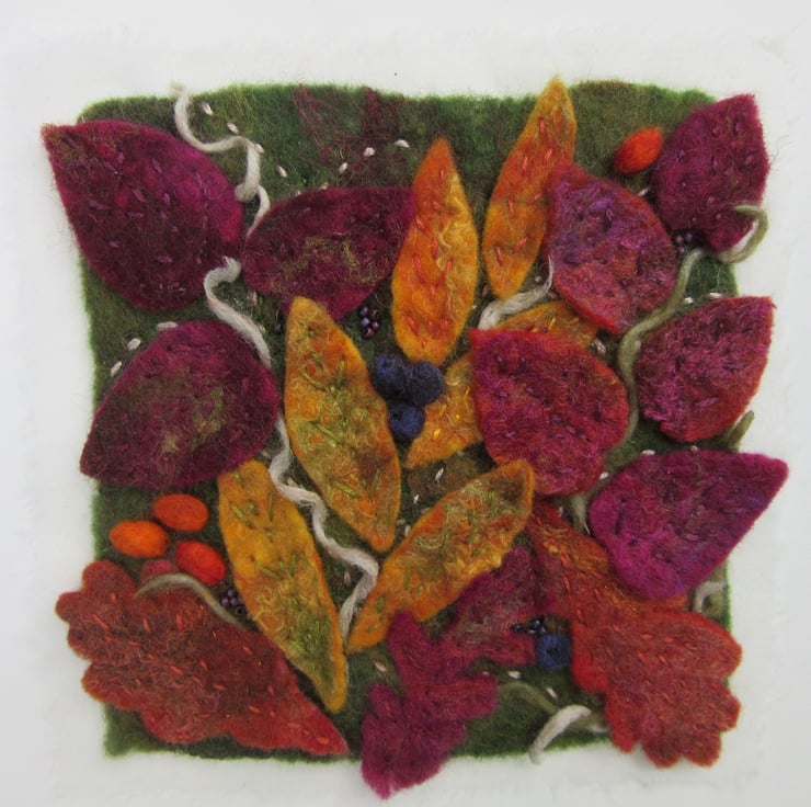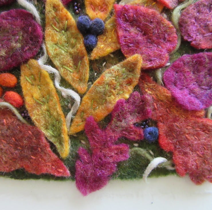 Berries and leaves have been shaped from hand made felt and applied to a felt background. The leaves, berries and background have been decorated with hand stitching to give a rich decorative 3D surface. The fruits and leaves are in autumn colours of orange, dark red and gold and the background is dark green.
