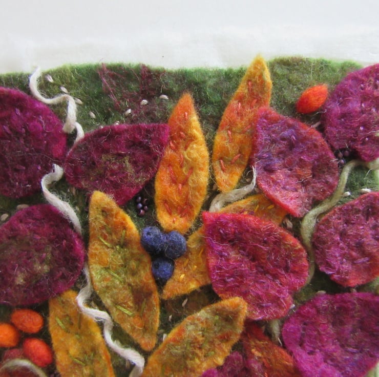 Hand felted picture of an autumn hedgerow made from 100% merino wool felt with added silk fibers in white frame.