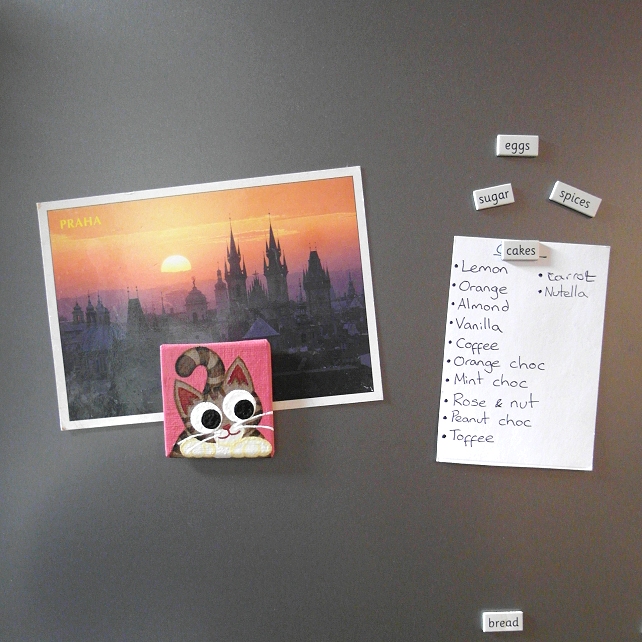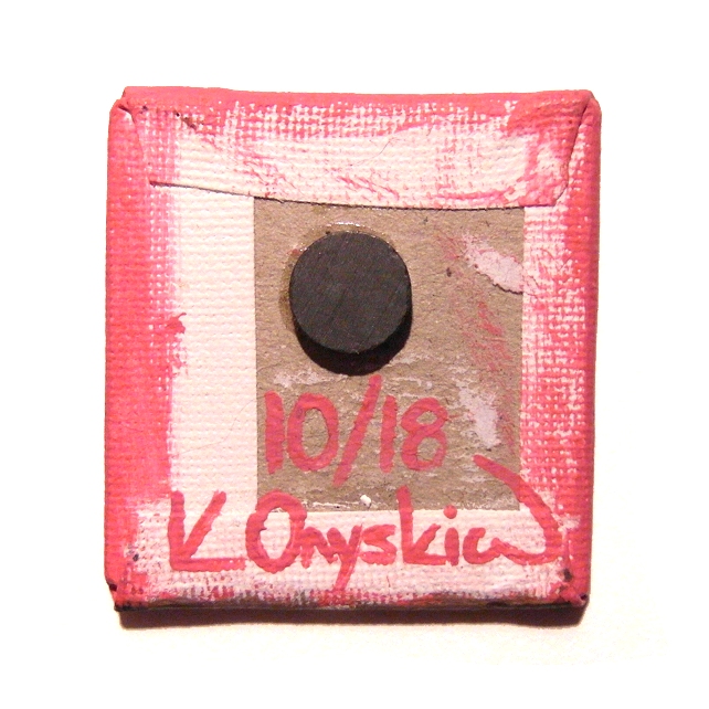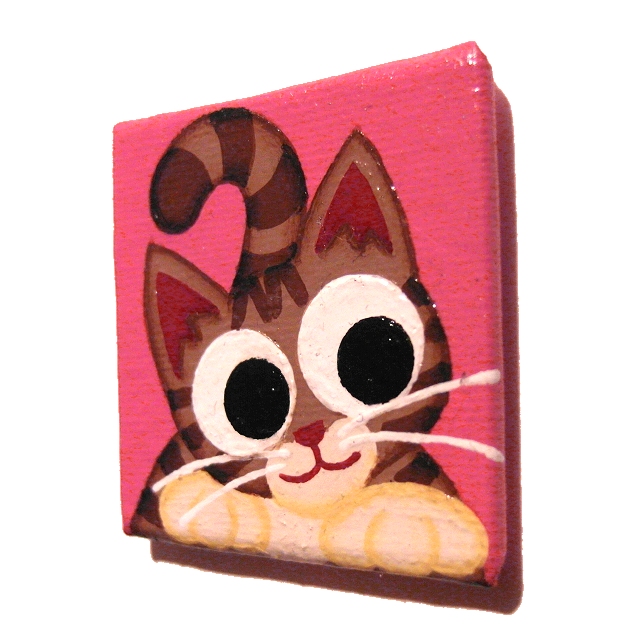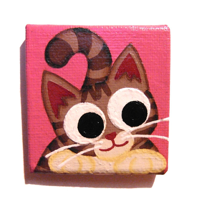 This original cartoon cat artwork is painted in acrylics on a 5cm x 5cm (2" x 2") canvas board, and has been coated with a layer of clear varnish to make it more durable. A 12mm magnet is attached to the back so this little painting can stick on a fridge or other magnetic surface.