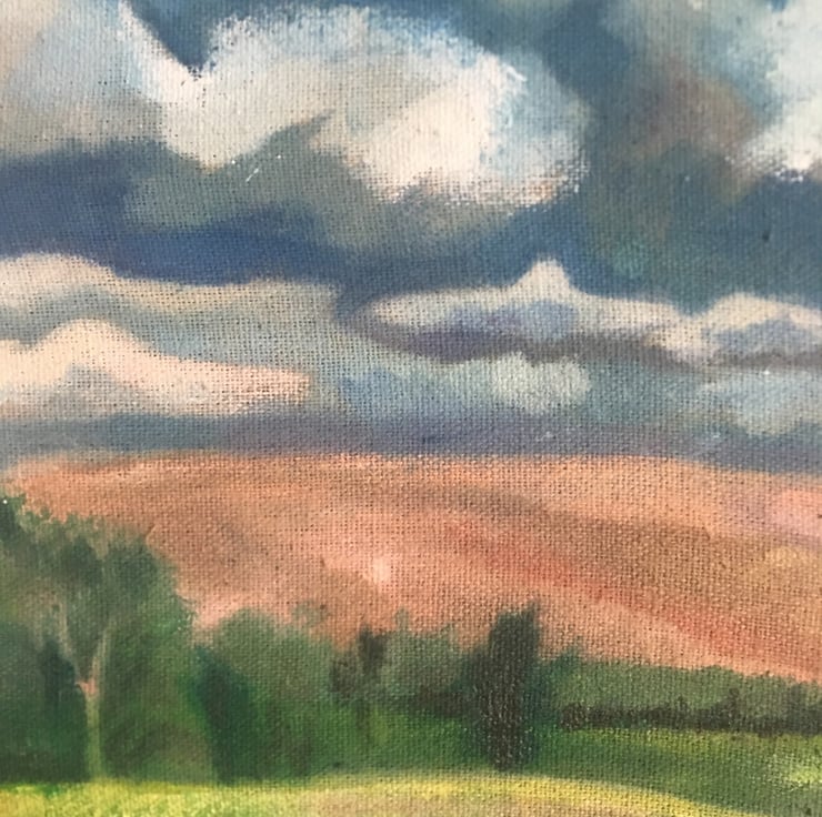 This painting is the view from Cumwhitton Park near where I live in Cumbria, a beautiful sunny day with clouds billowing over a newly ploughed field.