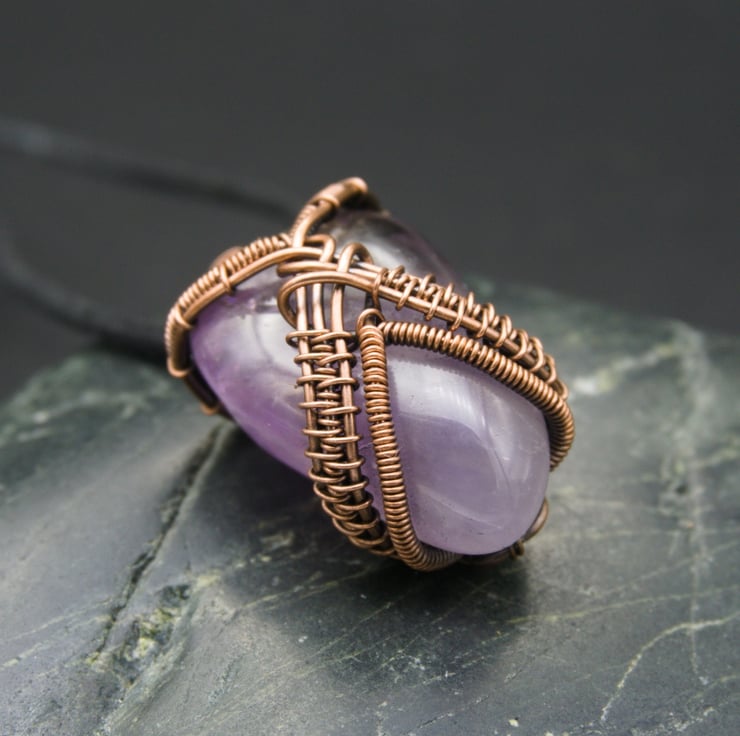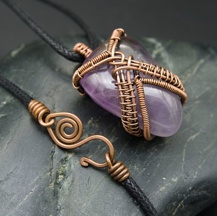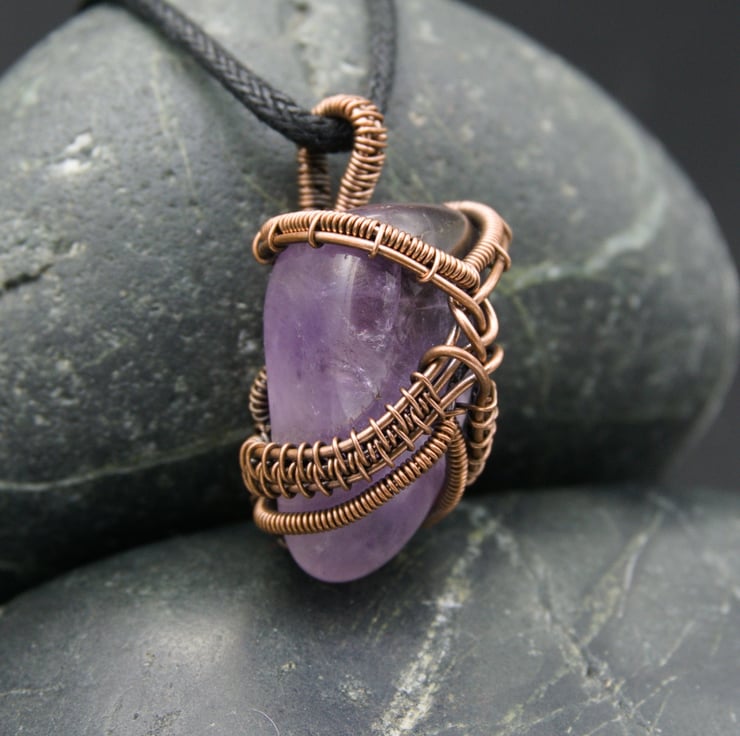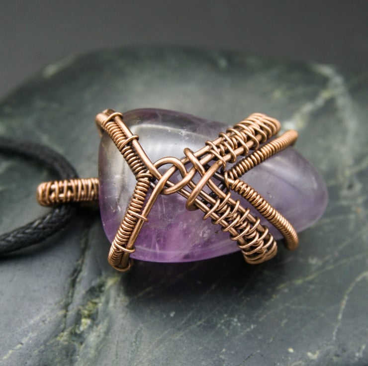 This one of a kind pendant has been made by wrapping woven copper weave around an undrilled Amethyst tumblestone. I've used different weaving patterns to wrap the stone, forming an x-shape with crisscrossed wires across the front, with the back finished with covered & bare spirals.