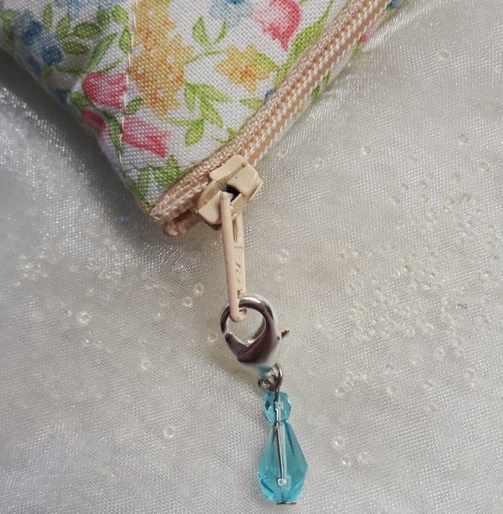 A decorative Crystal and glass beaded charm is attached to the zip.