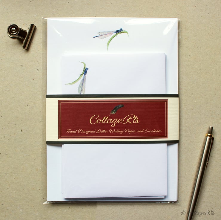 - 10 sheets of A5 100gsm laid letter writing paper with the Damselfly design in the top centre of the paper.