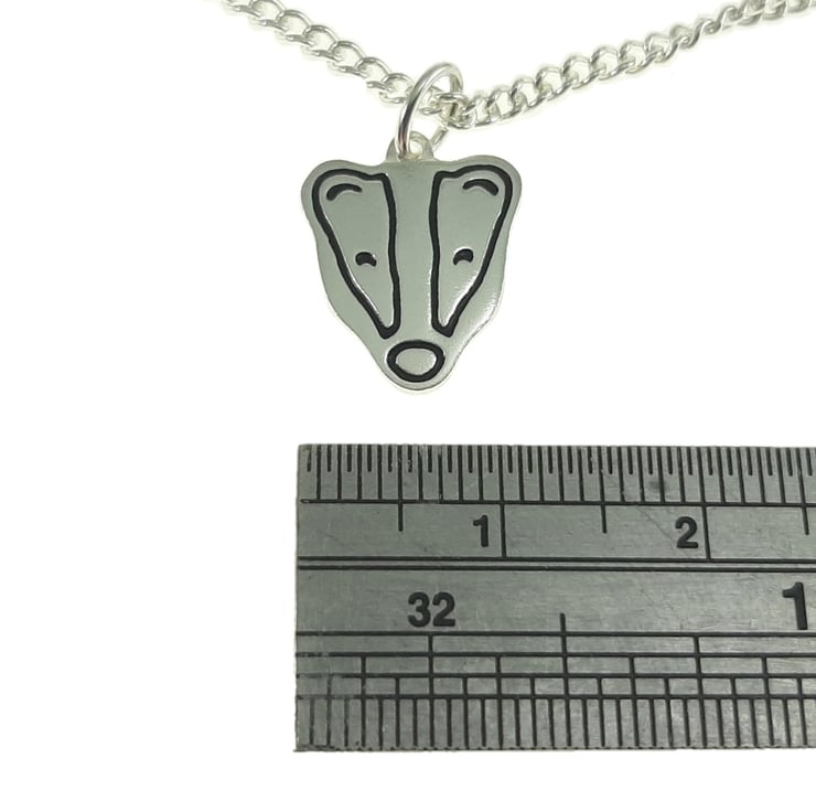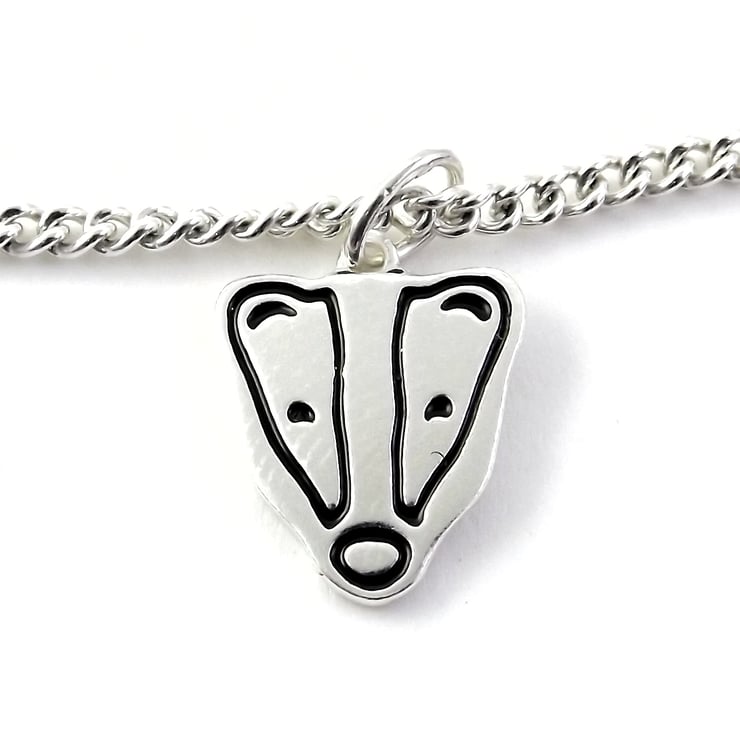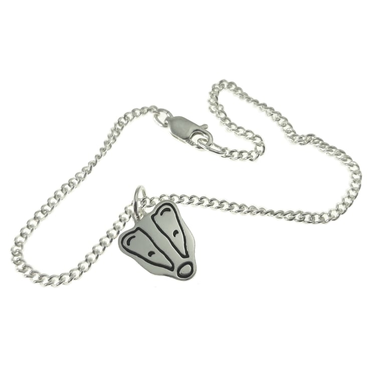 This badger bracelet has been lovingly crafted by hand in Shropshire. It is made from sterling silver sheet and is etched before being cut by hand. The edges are then smoothed using files and emery paper before it is given it's shape using a punch and hammer. A 5mm oval jump ring is then attached. A black resin based enamel is added to the etched areas and the piece is then polished before being attached to a chain.