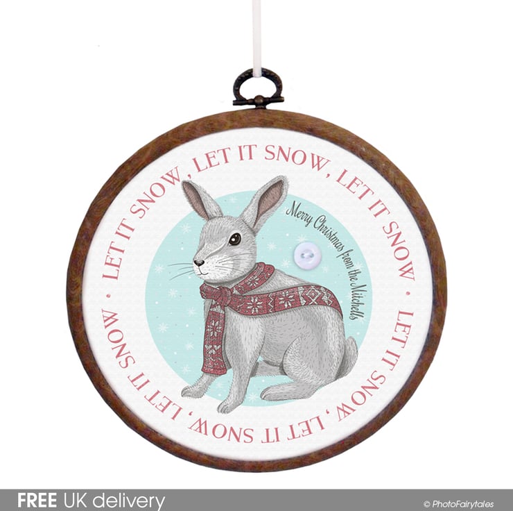 This Christmas Rabbit personalised embroidery hoop print will be a lovely festive finishing touch for your home this Christmas. Handmade to order, and personalised with your names or personal message, this delightful print will make a great gift or a bespoke Christmas decoration.