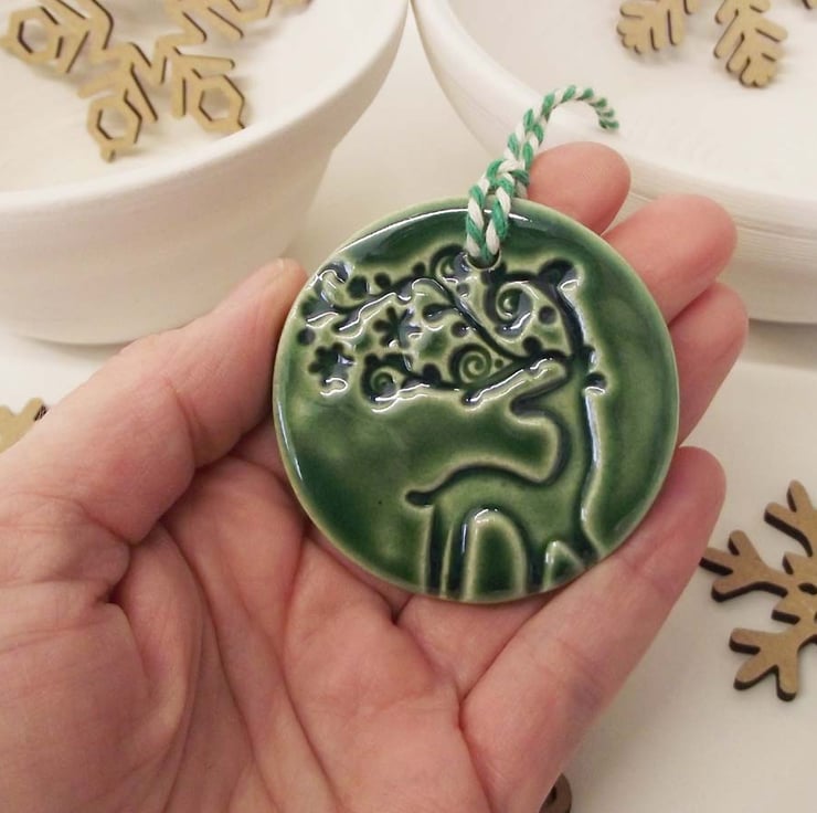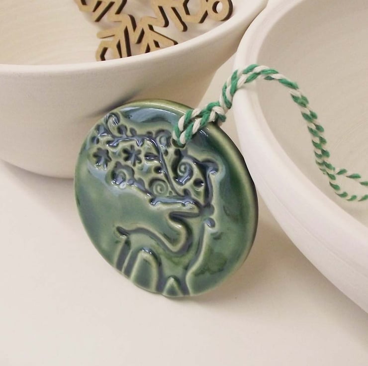This cute little stag decoration is made from white earthenware clay, fired once, a rich glossy green glaze is applied and it is then fired again - so is nice and strong. It measures 5cm x 5cm and hangs from a matching coloured string. It is glazed on the front and left plain on the back.