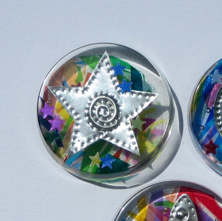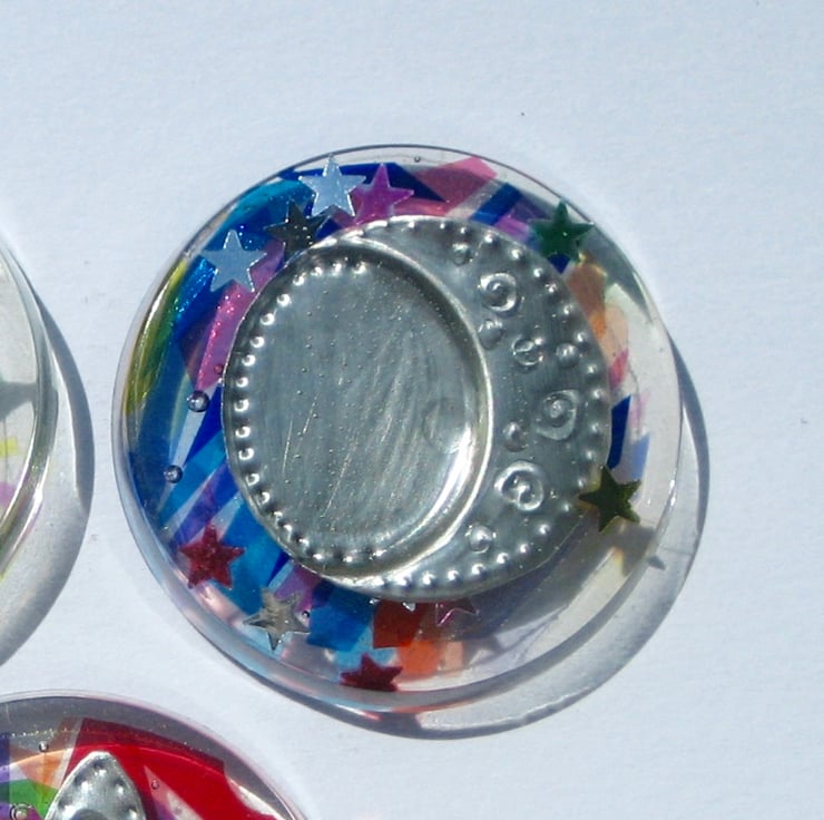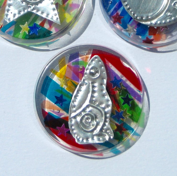 A fun little novelty gift for a man or woman who loves myth and magic, this set of fridge magnets depicts a hare, a moon and a star made from hand-embossed pewter set in crystal resin. Sprinkled with star confetti and backed in coloured cellophane, this gift set in unique and not available anywhere else.