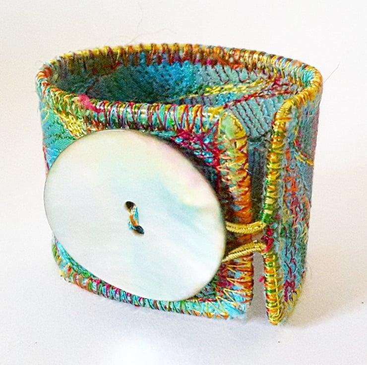 Made from layers of fabric including hand dyed Egyptian cotton and silk fabrics using the free machine embroidery style of sewing